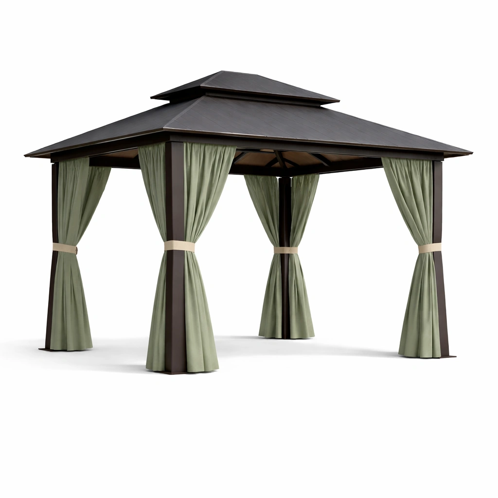 Der Pavillon besteht aus einem Aluminiumrahmen mit einem Dach aus verdicktem Polyester für erhöhte Wetterbeständigkeit. Die Vorhänge sind ebenfalls aus strapazierfähigem Polyester gefertigt.