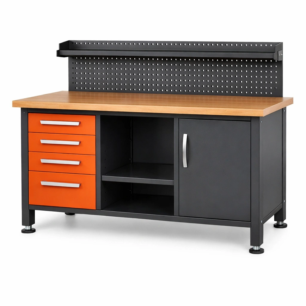 Material: Stahlkorpus, Holzarbeitsplatte, Kunststoffgriffe